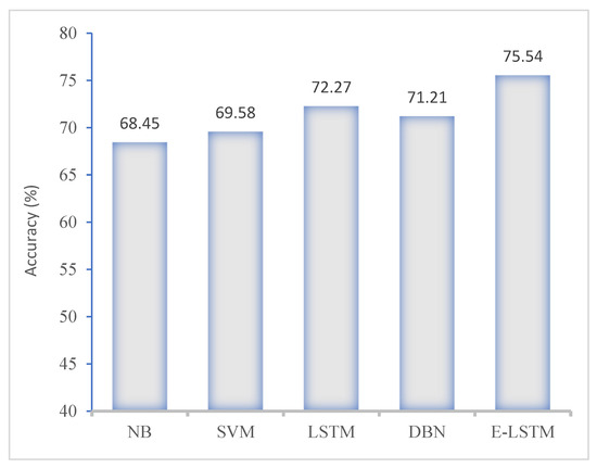 In our work, we assessed the stress analysis performance of the proposed E-LSTM model with comparative approaches such as naïve Bayes (NB), support vector machine (SVM), deep belief network (DBN) and long short-term memory (LSTM). Our developed E-LSTM model achieved excellent performance in the term of accuracy. Figure 9 shows the evaluation results of the proposed model and state-of-the-art approaches using the KNHANES-VI dataset.