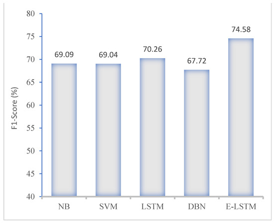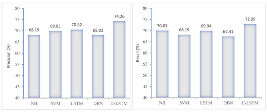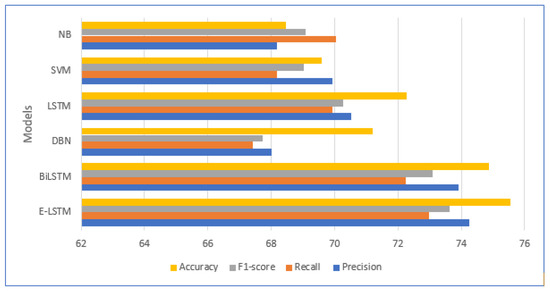Figure 12 illustrates the comparison results of the proposed model with state-of-the-art approaches in the terms of accuracy, precision, recall and F1-score. The proposed E-LSTM model obtained an accuracy of 75.54%, precision of 74.26%, recall of 72.99%, and F1-score of 74.58%. Conversely, the E-LSTM model has the advantage of saving time as it allows for the use of unlabeled training samples due to its supervised learning mechanism. As a result, the E-LSTM model performs better in terms of human labelling time.