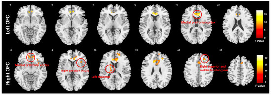 Regions with significant group differences in functional connectivity of the bilateral orbitofrontal cortex.