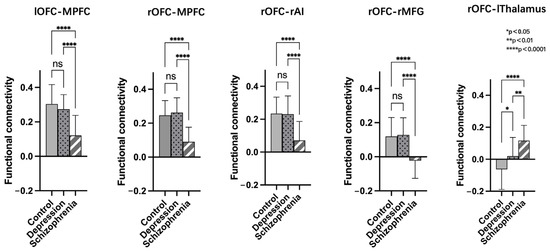 Post-hoc comparisons of functional connectivity differences in the bilateral orbitofrontal cortex (OFC) of the HC, SCH, and DEP group; ns: not significant.
