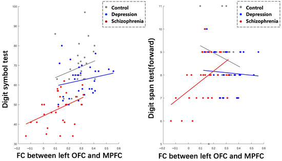 Interestingly, we found the patients with schizophrenia specifically exhibited reduced connectivity between the bilateral OFC with MPFC compared to both HC and the DEP group. This suggests that there may be disease-specific neurofunctional impairments in schizophrenia. The MPFC shares extensive anatomic connections with the OFC, and these two regions are part of a “visceromotor network” that is thought to modulate endocrine, autonomic, behavioral, and experiential aspects of emotional behavior [29,38]. In addition, the MPFC is believed to be the neural correlate of self-referential processing and also represents a core hub of the brain’s anterior DMN, which is consistently impaired in schizophrenia [39]. Both the OFC and MPFC are located in the PFC of the human brain [40], so the decoupling between OFC and MPFC was in line with previous studies and supports the hypothesis of PFC dysconnectivity in schizophrenia [41,42]. The PFC is involved in almost all cognitive functions and is essential for the organization and control of goal-directed thought and behavior [43]. Our results showed positive relationships between left OFC-MPFC FC and DST and DSPT (backward) scores specifically within the patients with schizophrenia. The DST is a measure of a person’s information processing speed while the DSST is a measure of working memory, requiring maintenance of information in memory. Our results suggest that the relationship between lOFC-MPFC FC and cognitive variables varies across different groups. Specifically, the association between FC and DST differs between healthy controls and individuals with depression, while the association between FC and DSPT (forward) differs across all three groups. This findings indicate that the cognitive deficits are differently related to the OFC-MPFC connectivity in these diseases.