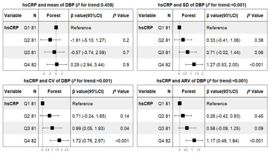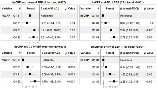The profiles of 24 h ABPM BP parameters in the subacute stage are summarized in Table 2. The weighted means of 24 h SBP and DBP were 142.1 ± 16.9 and 82.4 ± 10.9 mmHg, respectively. The mean values of SBP tended to be higher in patients with hsCRP ≥ 2 mg/L (147.2 ± 17.3 versus 138.2 ± 15.6, p < 0.001), but mean values of DBP did not (83.4 ± 12.5 versus 81.8 ± 9.5, p = 0.184). In contrast, both SBP and DBP fluctuations are larger in subjects with hsCRP at/above 2 mg/L. After adjusting for predetermined covariates of age, sex, BMI, smoking, hypertension, diabetes mellitus, atrial fibrillation, coronary heart disease, prior TIA or stroke, initial NIHSS, onset to ABPM, antihypertensive therapy, LDL, HDL, TOAST classification, and lesion patterns, linear regression analyses showed that hsCRP was not only significantly related to the BPV of SBP (β, 2.29 [95% CI 1.55–3.04] for SD; β, 1.21 [95% CI 0.72–1.71] for CV; β, 1.9 [95% CI 1.24–2.56] for ARV), but also the BPV of DBP (β, 0.93 [95% CI 0.41–1.46] for SD; β, 1.12 [95% CI 0.44–1.80] for CV; β, 0.93 [95% CI 0.45–1.41] for ARV). Not unexpectedly, hsCRP was significantly associated with mean SBP (β, 6.94 [95% CI 3.39–10.48]), but mean DBP was not (β, 0.99 [95% CI −1.29–3.27]) (Table 3). To further assess dose response, patients were additionally categorized into quartiles according to hsCRP levels using the lowest quartile as a reference category. Consequently, hsCRP was dose-dependently associated with mean SBP and all variability indices including SD, CV, ARV of SBP and DBP after adjusting for the same confounding factors mentioned above (Figure 1 and Figure 2).