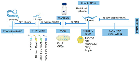 This study used strains Bristol N2 (wild-type), SJ4005 (hsp-4::GFP), SJ4100 (hsp-6p::GFP + lin-15(+)), and CL2006 (pCL12(unc-54/human Aβ1–42) + pRF4), worms genetically modified for human Aβ expression. These animals were obtained from the Caenorhabditis Genetics Center (CGC, Minnesota, USA). Worms were maintained in nematode growth medium (NGM) plates seeded with Escherichia coli OP50 at 15 or 20 °C. After reaching the adult stage, pregnant hermaphrodites were washed using a bleaching solution (2.4% NaOH and 1% NaClO in distilled H2O) to obtain eggs. At the first larval stage (L1), 1500 worms were acutely exposed to TQ, NCTQ, or NCBR at 1 and 10 µM for 30 min. The control group was exposed to dimethyl sulfoxide (DMSO) at 5% (TQ vehicle). Afterwards, the worms were washed three times with M9 buffer (KH2PO4 0.02 M, Na2HPO4 0.04 M, and NaCl 0.085 M) to remove the treatment. The animals were then placed on NGM plates seeded with E. coli OP50 until they reached the L4 larval stage (48 h after L1 stage). In the strain CL2006, the worms were exposed to an up-shift in temperature to a non-permissive 20 °C after the treatment to express the transgenic Aβ peptide in the body wall muscles (Figure 2).