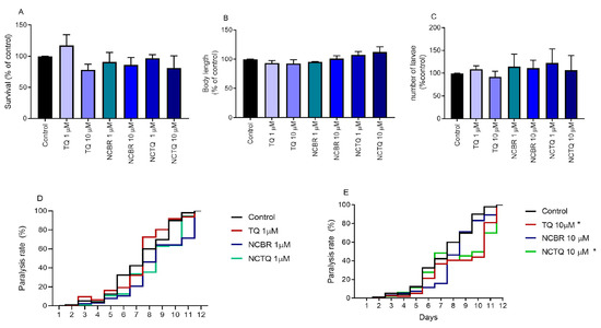 Toxicity endpoints of NCTQ in C. elegans. (A) Survival rate 48 h after the end of the treatment; (B) body length; (C) brood size. Data were analyzed by one-way ANOVA followed by Tukey’s post-hoc test; and paralysis rate caused by the expression of Aβ in C. elegans body–wall muscle cells and treated with free TQ or nanoformulation at (D) 1 µM; (E) 10 µM. Data were analyzed by RM one-way ANOVA followed by Dunnett’s post-hoc test. Asterisks indicate differences compared to the control group.
