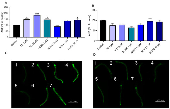 GFP intensity of reticular and mitochondrial chaperones in the strains (A) SJ4005 and (B) SJ4100. Data were analyzed by one-way ANOVA followed by Tukey’s post-hoc test; Asterisks indicate differences compared to the control group with * p < 0.05 and **** p < 0.0001. (C,D) are the representative images in strains S4005 and SJ4100, respectively: (1) Control, (2) TQ 1 µM, (3) TQ 10 µM, (4) NCBR 1 µM, (5) NCBR 10 µM, (6) NCTQ 1 µM, and (7) NCTQ 10 µM.