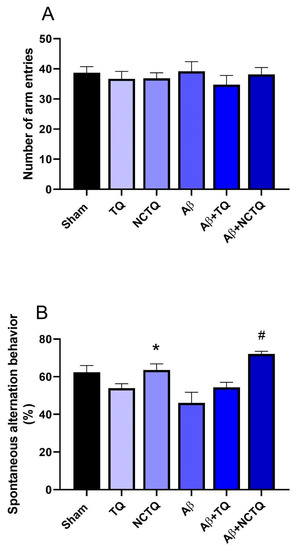 Effects of TQ, NCTQ, and/or Aβ on Y maze test in mice. (A) Number of arm entries; (B) spontaneous alternation behavior in the Y-maze task. Data are reported as mean ± standard error of the mean (SEM) of six to eight animals per group (one-way analysis of variance/Tukey’s test). (*) p < 0.05 as compared with the sham group. (#) p < 0.05 as compared with the Aβ group.