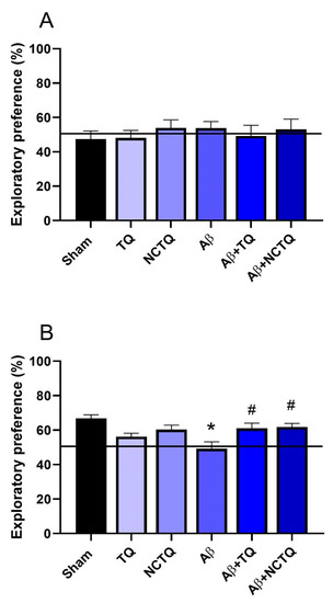 Effects of TQ, NCTQ, and/or Aβ on object recognition test in mice. (A) Time spent exploring one of the objects during the memory acquisition phase (training); (B) LTM (percentage of time spent exploring the novel object, a test carried out 24 h after training). Data are reported as mean ± standard error of the mean (SEM) of six to eight animals per group (one-way analysis of variance/Tukey’s test). (*) p < 0.05 as compared with the sham group. (#) p < 0.05 as compared with the Aβ group.