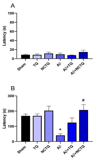 Effects of TQ, NCTQ, and/or Aβ on step-down inhibitory avoidance test in mice. (A) Latency (s) to fall from the platform in the step-down inhibitory avoidance in the training; (B) probe section. Data are reported as mean ± standard error of the mean (SEM) of six-eight animals per group (one-way analysis of variance/Tukey’s test). (*) p < 0.05 as compared with the Sham group. (#) p < 0.05 as compared with the Aβ group.