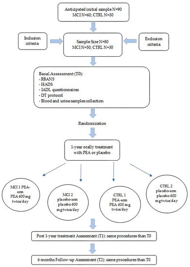 Study flowchart. CTRL: controls; DT: dual task; HADS: Hospital Anxiety and Depression Scale; IADL: Instrumental Activities of Daily Living; MCI: mild cognitive impairment; PEA: N-palmitoylethanolamine; RBANS: Repeatable Battery for the Assessment of Neuropsychological Status; T0: time 0; T1: time 1; T2: time 2.