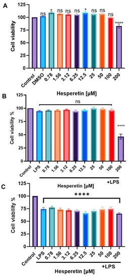 (A) the effect of hesperetin treatment (0.78–200 µM) on cell viability of BV-2 microglial cells for 24 h; (B) The effect of the combination of hesperetin and LPS (1 μg/mL) on cell viability of BV-2 microglial cells for 24 h; (C) The effect of hesperetin and LPS on cell viability of BV-2 microglial cells for 48 h. All the experiments were performed at 5% CO2/atm for 24 or 48 h. The data are presented as mean ± SEM (3 independent experiments), and the significance of differences from the control was determined by a one-way ANOVA and Dunnett’s multiple comparison tests.* p < 0.005, **** p < 0.0001, ns = non-signifigant.