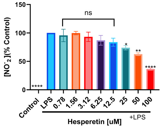 The effect of hesperetin on nitrite production (%) on LPS-activated BV-2 microglial cells stimulated with LPS (1 μg/mL). The data are presented as mean ± SEM (3 independent experiments). A one-way ANOVA evaluated the significance of the difference between LPS and treatments, followed by Dunnett’s multiple comparison test * p < 0.05, ** p < 0.01, **** p < 0.0001, ns = nonsignificant.