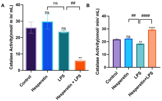 The effect of hesperetin on catalase activity with respective treatments at 24 h (A) and 48 h (B). The data are presented as mean ± SEM (3 independent experiments). A one-way ANOVA evaluated the significance of the difference between control vs. all treatments (** p < 0.01 and **** p < 0.0001), and LPS vs. all treatments (## p < 0.01 and #### p < 0.0001), followed by Dunnett’s multiple comparison test. ns = non-significant.
