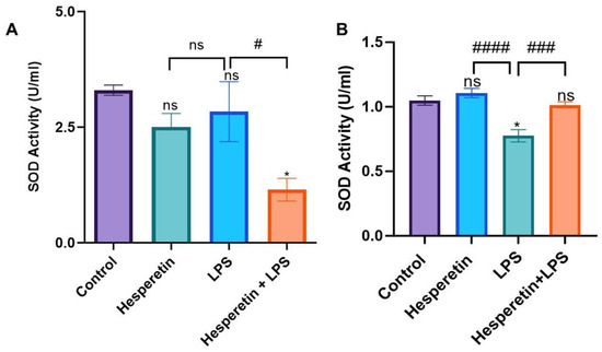 The effect of hesperetin on superoxide dismutase activity with respective treatments at 24 h (A) and 48 h (B). The data are presented as mean ± SEM (3 independent experiments). The significance of the difference between control vs. all treatments (* p < 0.05) and LPS vs. all treatments (# p < 0.05, ### p < 0.001, and #### p < 0.0001) was evaluated by a one-way ANOVA, followed by Dunnett’s multiple comparison test. ns = non-significant.