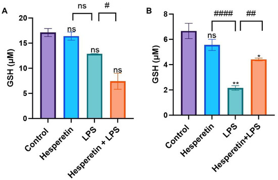 The effect of hesperetin on glutathione concentration (μM) with respective treatments at 24 h (A) and 48 h (B). The data are presented as mean ± SEM (3 independent experiments). A one-way ANOVA evaluated the significance of the difference from control vs. all treatments (* p < 0.05, ** p < 0.01) and LPS vs. co-treatment (# p < 0.05, ## p < 0.01, #### p < 0.0001), followed by Dunnett’s multiple comparison test. ns = non-significant.