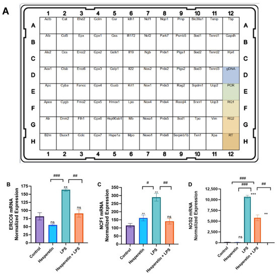 (A) PCR Array layout. Positive controls are in the lower-right column. (B) Effect of hesperetin on normalized mRNA expression of ERCC6, (C) NCF1, and (D) NOS2. The data are presented as mean ± SEM (3 independent experiments). A one-way ANOVA evaluated the significance of the difference between control vs. all treatments (** p < 0.01 and *** p < 0.001) and LPS vs. all treatments (# p < 0.05, ## p < 0.01, and ### p < 0.001), followed by Dunnett’s multiple comparison test. ns = non-significant.