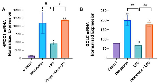 Effect of hesperetin on normalized mRNA expression of (A) HMOX1 and (B) GCLC. The data are presented as mean ± SEM (3 independent experiments). A one-way ANOVA evaluated the significance of the difference between control vs. all treatments, (* p < 0.05, ** p < 0.01) and LPS vs. all treatments (# p < 0.05, ## p < 0.01), followed by Dunnett’s multiple comparison test. ns = non-significant.
