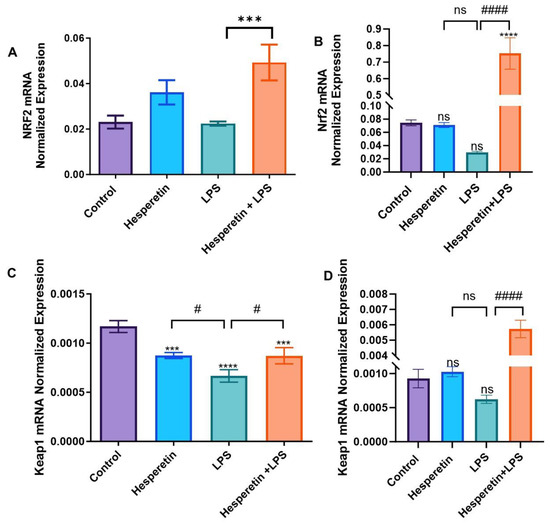 The effect of hesperetin on Keap1 (A) 24 h and (B) 48 h and Nrf2 mRNA normalized expression (C) 24 h and (D) 48 h. The data are presented as mean ± SEM (3 independent experiments). A one-way ANOVA evaluated the significance of the difference between control vs. all treatments (*** p < 0.001, and **** p < 0.0001) and LPS vs. all treatments (# p < 0.05 and #### p < 0.0001), followed by Dunnett’s multiple comparison test. ns = nonsignificant.