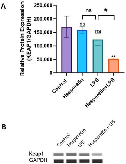 (A) The effect of hesperetin on Keap1 protein expression. (B) Bands representing the protein expression of four treatments at 48 h. The data are presented as mean ± SEM (3 independent experiments). A one-way ANOVA evaluated the significance of the difference between control vs. all treatments (** p < 0.010 and LPS vs. all treatments (# p < 0.05), followed by Dunnett’s multiple comparison test. ns = non-significant.