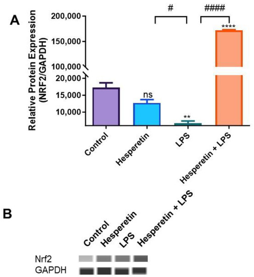 (A) The effect of hesperetin on Nrf2 protein expression. (B) Bands representing the protein expression after treatments at 48 h. The data are presented as mean ± SEM (3 independent experiments). A one-way ANOVA evaluated the significance of the difference between control vs. all treatments (** p < 0.01 and **** p < 0.0001) and LPS vs. all treatments (# p < 0.01 and #### p < 0.0001), followed by Dunnett’s multiple comparison test. ns = non-significant.