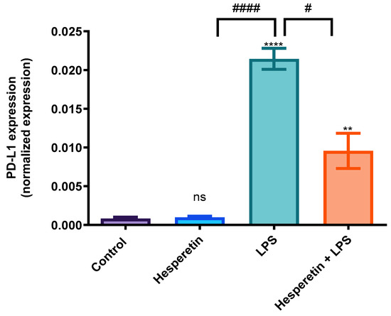 Hesperetin’s effect on PD-L1 mRNA normalized expression. The data are presented as mean ± SEM (3 independent experiments). A one-way ANOVA assessed the significance of the difference between control vs. treatments (** p < 0.01 and **** p < 0.0001) and LPS vs. treatments (# p < 0.05, #### p < 0.0001), followed by Dunnett’s multiple comparison test. ns = non-significant.