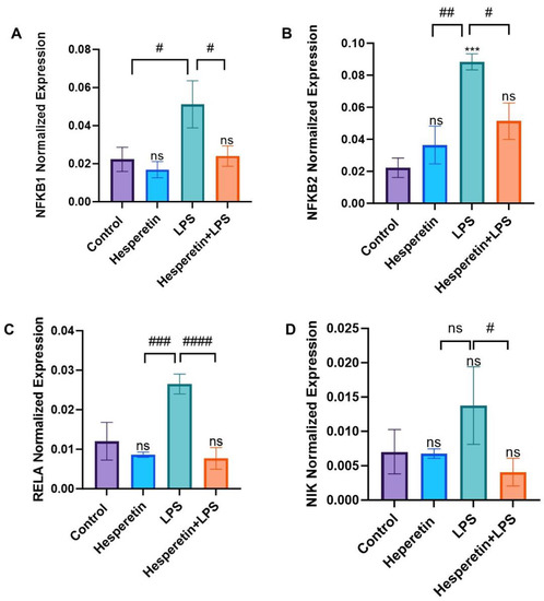 The effect of hesperetin on (A) NF-kB1, (B) NF-kB2, (C) RELA, and (D) NIK mRNA normalized gene expression. The data are presented as mean ± SEM (3 independent experiments). A one-way ANOVA evaluated the significance of the difference between control vs. all treatments (*** p < 0.001) and LPS vs. all treatments (# p < 0.05, ## p < 0.01, ### p < 0.001, and #### p < 0.0001), followed by Dunnett’s multiple comparison test. ns = non-significant.