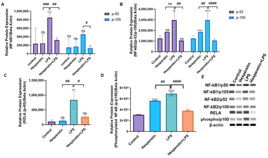 Hesperetin’s Effect on NF-kB-associated proteins. NF-kB1 (A), NF-kB2 (B), RELA (C), p-NF-kB2 (D). Bands represent the protein expression in each treatment. The data are presented as mean ± SEM (3 independent experiments). A one-way ANOVA assessed the significance of the difference between control vs. treatments (* p < 0.05, ** p < 0.01, *** p < 0.001, and **** p < 0.0001) and LPS vs. treatments (# p < 0.05, ## p < 0.01, ### p < 0.001, #### p < 0.0001), followed by Dunnett’s multiple comparison test., ns = nonsignificant.