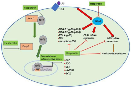 In this investigation, LPS-stimulated BV-2 microglial cells were used. This is a well-characterized model used in research, especially in the study of neurodegenerative disorders involving immune responses, including oxidative stress and neuroinflammation. Many articles describe that BV-2 cells are compatible substitutes for the use of primary microglia in several experimental assays as well as in studies of a more complex nature involving cell–cell interaction [60]. Studies described that comparing BV-2 cell lines with primary rat microglia showed that LPS stimulation caused BV-2 cells to secrete lesser but still significant amounts of NO compared with primary microglia [61]. Henn et al. [60] investigated the BV-2 cells as a suitable alternative to the primary cultures. They described that in response to LPS, 90% of genes induced in the BV-2 cells were also induced in primary microglia, indicating that this is a good research model. However, further studies will be needed using in vivo models to validate and elucidate the molecular mechanisms used by hesperetin to ameliorate oxidative stress and inflammation.
