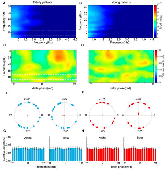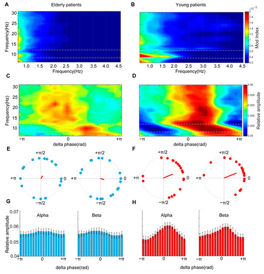 3.4. Phase–Amplitude Couplings between the Delta Phase and Alpha/Beta Amplitude Were Impaired in Elderly Patients during General Anesthesia