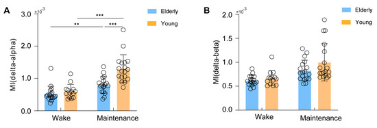 (A) the MI of the delta phase to alpha amplitudes in both young and elderly patients (B) the MI of the delta phase to beta amplitudes in both young and elderly patients. Change in MI values in elderly and young patients in the wake vs. anesthesia maintenance period. Statistical significance is indicated as ** Padj < 0.01, and *** Padj < 0.001.