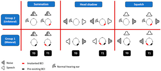 - Group 1. Time 0: tests were performed using only the BCI in the worse ear, without wearing the contralateral one for 1 week. In fact, in case of patients affected by bilateral hearing loss implanted with bilateral aids, the ear that underwent surgery first was the one that showed lower verbal perception, so the worse ear was chosen to be aided first. Time 1: tests were performed with bilateral BCI.