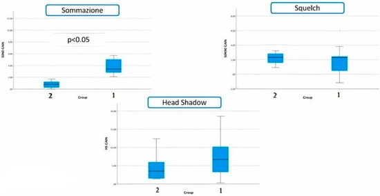 - Patients of group 2 reported heterogeneous scores in terms of binaural benefits but showed a real binaural achievement also in the squelch setting, with a mean of −4.59 dB at time 1 and a difference of 1.53 dB if compared to the baseline situation. Since all patients in this group have been implanted in adulthood, we may assume that they experienced the same binaural hearing deprivation. For this reason, this heterogeneity in scores might be ascribed to the different individual TAs of each subject of the study.