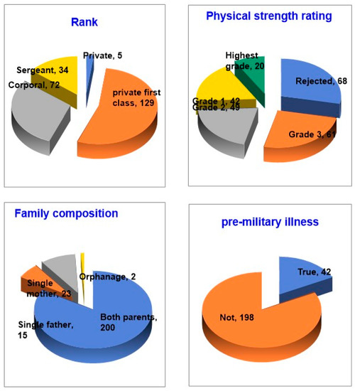 Looking at the demographic characteristics of the study subjects, 94 (39.2%) were 20 years old, with one each of 18 and 32 years old. In terms of education, 171 (71.2%) were enrolled in college, and 58 (24.2%) had a high school diploma or less, including one middle school graduate. Other general characteristics of the study subjects, such as rank and physical fitness, are shown in Figure 2.