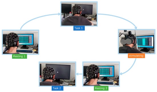 Transcranial magnetic stimulation (TMS) is a non-invasive intervention technique used to stimulate the human brain and investigate its physiological mechanisms. At present, TMS technology has been used in the treatment of Alzheimer’s disease, stroke, depression, and other neuropsychiatric diseases [,]. The brain regions selected for stimulation have a crucial influence on the effects of stimulation []. Target regions are typically selected based on the target function and the brain circuit mechanism of cognitive processing [,]. The target regions of TMS intervention in the past have mainly been in the cerebral hemisphere. The most commonly studied sites in research on cognition and memory include the left dorsolateral prefrontal cortex, the right inferior frontal gyrus, the right superior temporal gyrus, and the precuneus cortex [,]. The stimulation frequency affects the neuromodulation effect of TMS []. At present, repetitive transcranial magnetic stimulation (rTMS) is widely used in clinical practice. High-frequency (frequency > 1 Hz) rTMS can increase cortical excitability, induce long-term potentiation, and enhance synaptic plasticity. Low-frequency (frequency ≤ 1 Hz) rTMS can inhibit cortical excitability, reduce synaptic activity, and induce long-term depression. In general, the higher the frequency of rTMS, the stronger the excitatory effect. However, frequencies higher than 20 Hz are rarely used due to safety concerns and subject tolerance. In addition, different intensities of stimuli also have varying effects []. Studies have found that different brain wave oscillation frequencies are involved in various brain activities, and theta oscillation waves may serve as an indicator of memory and attention processing []. However, there is no uniform standard for the frequency of TMS stimulation used to improve cognitive function.