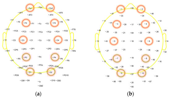 Channel location. The channels circled in the picture were used for ERP analysis. (a) Channels’ name; (b) Channels’ number.