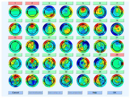 Removal of non-electroencephalogram components. Only the first 35 components are shown in the figure. The components marked in red have been removed.