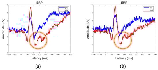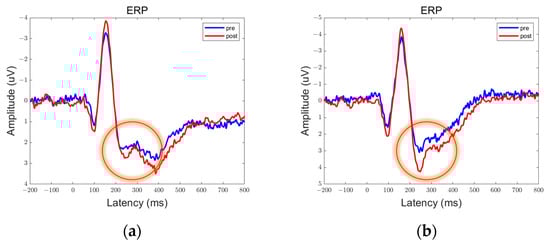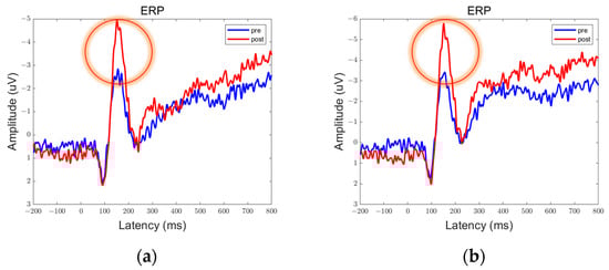 ERPs in the parietal lobe in the Group 20 Hz. There were statistically significant differences in the data in the encircled circles. (a) P3; (b) P4.