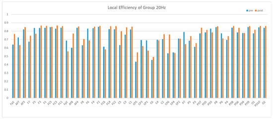 Then, the same method was used to analyze the global efficiency of the Alpha band and Beta band. No significant difference was found before and after stimulation in the Beta band. However, in the Alpha band, a significant increase in global efficiency was found after 20 Hz stimulation, while no difference was observed in the other groups. The results of the Alpha band are shown in Table 5.