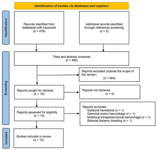 To address the pertinent clinical matter, a systematic literature review was meticulously conducted in accordance with the PRISMA statement []. The PubMed and Ovid MEDLINE electronic databases were thoroughly searched. A comprehensive search strategy involving MeSH (Medical Subject Headings) terms and keywords was implemented, utilizing the Bolean operator “AND”. The keywords employed were “ventriculoperitoneal shunt” and “intracranial hemorrhage”, which enabled the identification of a total of 478 studies. The titles and abstracts of these studies were carefully assessed to identify those of interest. Studies lacking a clear definition and description of epidemiological data pertaining to patients affected by DICH following EVD/VPS were excluded from the final analysis. Additionally, studies detailing diverse presentations of hemorrhage were further scrutinized to identify any relevant articles on the specific topic, resulting in the inclusion of 5 additional pertinent articles. The selection of studies was performed in accordance with the PRISMA flow chart, as illustrated in Figure 1. Notably, few series reported on both early and delayed intracranial hematomas, and within the latter group, we exclusively included patients meeting the defined criteria for DICH [].