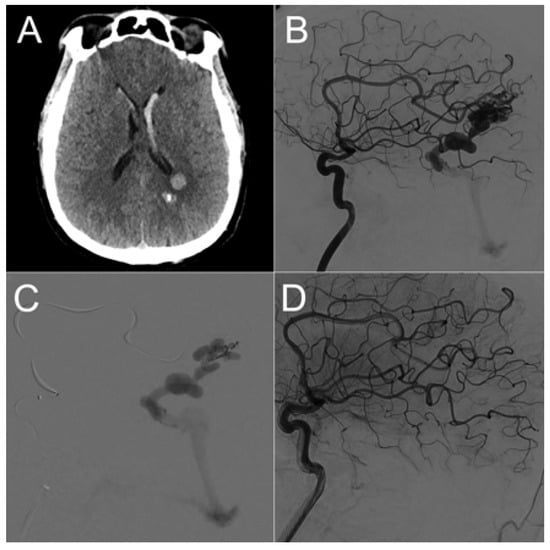 Male patient in his 40s presenting with acute onset of headache. Emergency brain CT scan (A) revealed left parietal intraparenchymal hematoma and intraventricular hemorrhage. Digital subtraction angiography of the left internal carotid artery (ICA) lateral projection (B) showed an underlying left parietal bAVM. The two main arterial feeders originated from the pericallosal artery. Endovascular embolization was performed via distal microcatheterization of the feeders and ultra-selective angiography (C) followed by an injection of the embolic product (Onyx 18, Ev3 Neurovascular, Irvine, CA, USA). The final angiographic of the left ICA (D) shows complete bAVM exclusion.