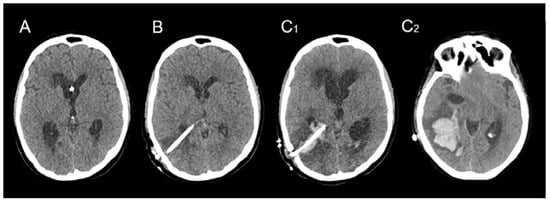 Illustrative case vignette of one patient’s consecutive CT scans: preoperative scan (A), early post-operative check within 24 h (B) and delayed (5 days) scan after neurological deterioration (C1,C2) showing hematoma at the level of the catheter (C1) and extension below (C2).