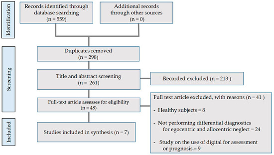 This paper reviews DTx studies on frames of reference in neglect (egocentric neglect and allocentric neglect) related to brain injuries. Relevant studies from 1980 to 2023 were identified by accessing the following electronic databases: Web of Science, PubMed, and Google Scholar. The following keywords were used to search the databases: neglect, apple test, heart test, egocentric neglect, allocentric neglect, digital therapeutics, and brain injury. This review was limited to studies involving human subjects with neglect. The relevant studies were selected based on the flow chart shown in Figure 1. A total of seven studies were selected and reviewed. Five studies were in medical journals, four of which were research studies [32,33,34,35], and one was a case study [24]. Two studies were in non-medical journals, both of which were conference papers [23,36] (Table 2).
