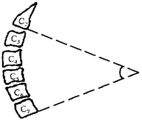 Cobb angle of cervical curvature. The angle formed by the parallel line of C2 lower endplate and C7 lower endplate represents the curvature of cervical vertebra.