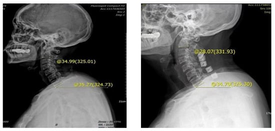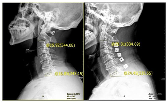 Cervical sagittal balance plays a pivotal role in spine surgeries, particularly cervical laminoplasty due to its significant impact on the clinical outcomes in cervical spine surgery [,]. Moreover, cervical balance serves an important function in defining surgical strategy and predicting clinical outcomes following surgery [,,]. In line with advances in image processing and modeling, different radiologic and imaging factors have been proposed to manifest cervical balance and to evaluate its usefulness []. Studies on cervical sagittal alignment were initially focused on normative data but then expanded into correlation with global sagittal balance, prognosis of various conditions, surgery outcomes, definition and classification of cervical deformity, and prediction of targets for ideal cervical reconstruction [,,]. In recent years, different markers such as thoracic inlet angle (mimicking pelvic incidence in the thoracolumbar spine), T1 slope (T1s), and T1s minus cervical lordosis (TS-CL) have been introduced as pivotal parameters for assessment of cervical sagittal balance in cervical laminoplasty. Several studies have revealed the usefulness of these radiological parameters; however, the accurate measurement of T1s is a challenging procedure for many patients because of their short necks or impediment of shoulder shading. This fundamental limit impedes the usefulness and accuracy of these cervical parameters to all patients.