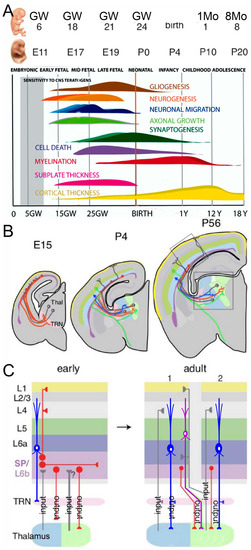 (A) This image shows the time points depicting the development of humans (in gestation weeks, GW; postnatal month, 1Mo; age, 1Y) and mice (embryonic, E; postnatal, P). Note that the first sound responses can be elicited in humans. Additional generation of granule cells is not indicated. (B) Thalamocortical connectivity is shown in mice that start in E15 and continue past P56, extending into the auditory cortex (AC). (C) The first reciprocal connections from the AC back to the thalamus (blue neurons in (B,C)) also have a transient input (TRN, early). Note that the adult mouse has a different input and output from primary (1) and secondary (2) input/output. It was modified after [,].