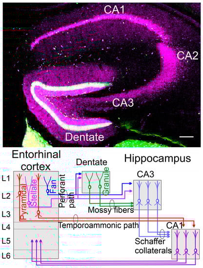 (Top) A coronal section is taken from a 48-day-old mouse using calbindin (lilac) and calretinin (green) in a transgenic expression. (Bottom) The dentate gyrus receives the perforant pathway from stellate and fan neurons that also split to innervate the CA3. Mossy fibers extend from granular neurons to innervate the CA3 by pyramidal neurons. Here are the Schaffer collaterals to innervate the CA1 that also receives the input from the temporoammonic path. The fibers’ process returns from CA1 to the entorhinal cortex in L5 by pyramidal neurons (not shown)—unpublished data (top) and modified (bottom) after [,].