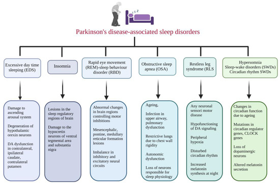 The illustration describes various sleep disorders associated with Parkinson’s disease and their causes and neurological changes. EDS: excessive daytime sleeping; DA: dopamine; REM: rapid eye movement; RBD: REM sleep behavior disorder; OSA: obstructive sleep apnea; RLS: restless legs syndrome; SWD: sleep–wake disorder; CLOCK: circadian locomotor output cycles kaput. (Figure created using BioRender.com; accessed on 27 June 2023).