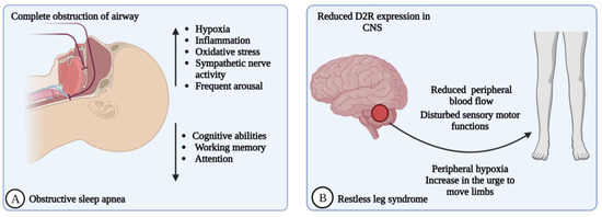 (A) Obstructive sleep apnea (OSA): The episodic breathing session and repeated obstructions in the upper airway worsen nocturnal respiration and sleep. OSA produces irregular respiratory patterns, hypoventilation, nocturnal worsened respiration, and oxidative stress due to the resaturation and desaturation of oxygen levels, and produces damage to dopaminergic neurons. (B) Restless legs syndrome (RLS): Hypo-functioning of dopamine signaling due to reduced dopamine subtype 2 receptor (D2R) expression in the CNS. Reduced peripheral blood flow causes peripheral hypoxia, which leads to urges to move legs and causes defects in neurological sensorimotor functions. (Figure created using BioRender.com; accessed on 27 June 2023).