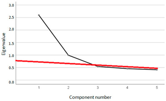 Table 3 displays the eigenvalues of the factors, confirming that only the first two factors meet the Kaiser criterion. According to Turner (1998) and Ruscio and Roche (2012) [94,100], the difference between eigenvalues of 1.01 and 0.99 is negligible and may be attributed to sampling error. The same table reveals that the two factors account for 71.81% of the total variation (51.92% and 19.89%, respectively).