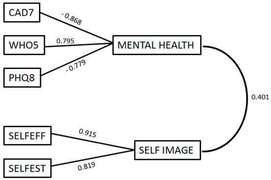 PCA factor analysis was performed using 502 observations (251 questionnaires before and 251 after) on 5 quantitative variables (CAD7, WHO5, PHQ8, SELFEFF, SELFEST). Factor analysis is a dimensionality reduction method carried out by grouping variables that have a common meaning [86,87]. To determine the suitability of the data for the application of factor analysis, two tests were conducted [88]: (a) the Kaiser–Meyer–Olkin (KMO) test was used to assess the adequacy of the sample [89] and (b) Bartlett’s test of sphericity was used to determine whether the variables are sufficiently correlated in the correlation matrix [90]. A loading value of 0.70 was considered substantial for each factor selection [91], and Cattell’s Scree Test was used to determine the number of factors [92,93]. The eigenvalues of the factors confirmed the selection [94]. Both orthogonal (varimax) and oblique rotations were performed, and the component correlation matrix of the oblique rotation showed a moderate correlation between factors. Therefore, oblique rotation was used [89]. The resulting factor scores for the two factors (latent variables) were used for subsequent analyses.