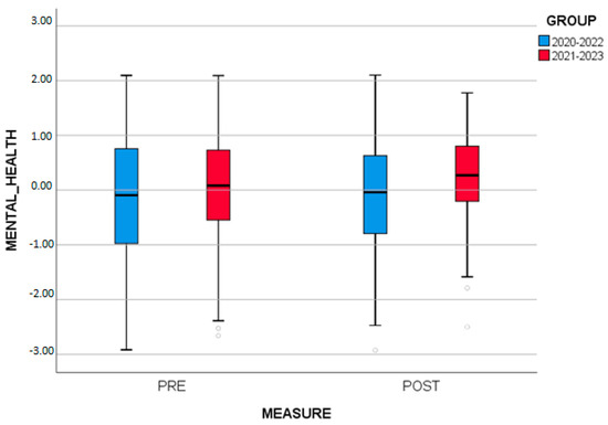 Analysis of variance with one repeated factor and one independent factor (two-way repeated measures ANOVA) was applied to examine if there were differences in MENTAL_HEALTH between measurements (initial, final) and GROUPS (2020–2022, 2021–2023). The results show that there is a statistically significant interaction between measurements and GROUPS (p = 0.007). Analyzing the interaction in terms of measurement, it was found that there were no statistically significant differences in MENTAL_HEALTH between initial (pre) and final (post) in the group 2020–2022 (p= 0.883). On the contrary, statistically significant differences were found in MENTAL_HEALTH between initial (pre) and final (post) in the group 2021–2023 (p < 0.001). Examining the means, it appears that participants had a higher score in MENTAL_HEALTH after the SCS (M = 0.25 ± 0.81) compared to the initial measurement (M = 0.003 ± 1.01) (Figure 3).